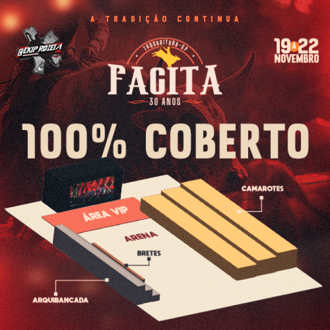 O setor Arena / Arquibancada terá entrada gratuita. Para os demais setores, os ingressos podem ser adquiridos pelo site da Tycket https://www.tycket.com.br/catalog/product/view/id/18449/s/rodeio-facita-30-anos-taquarituba-sp/